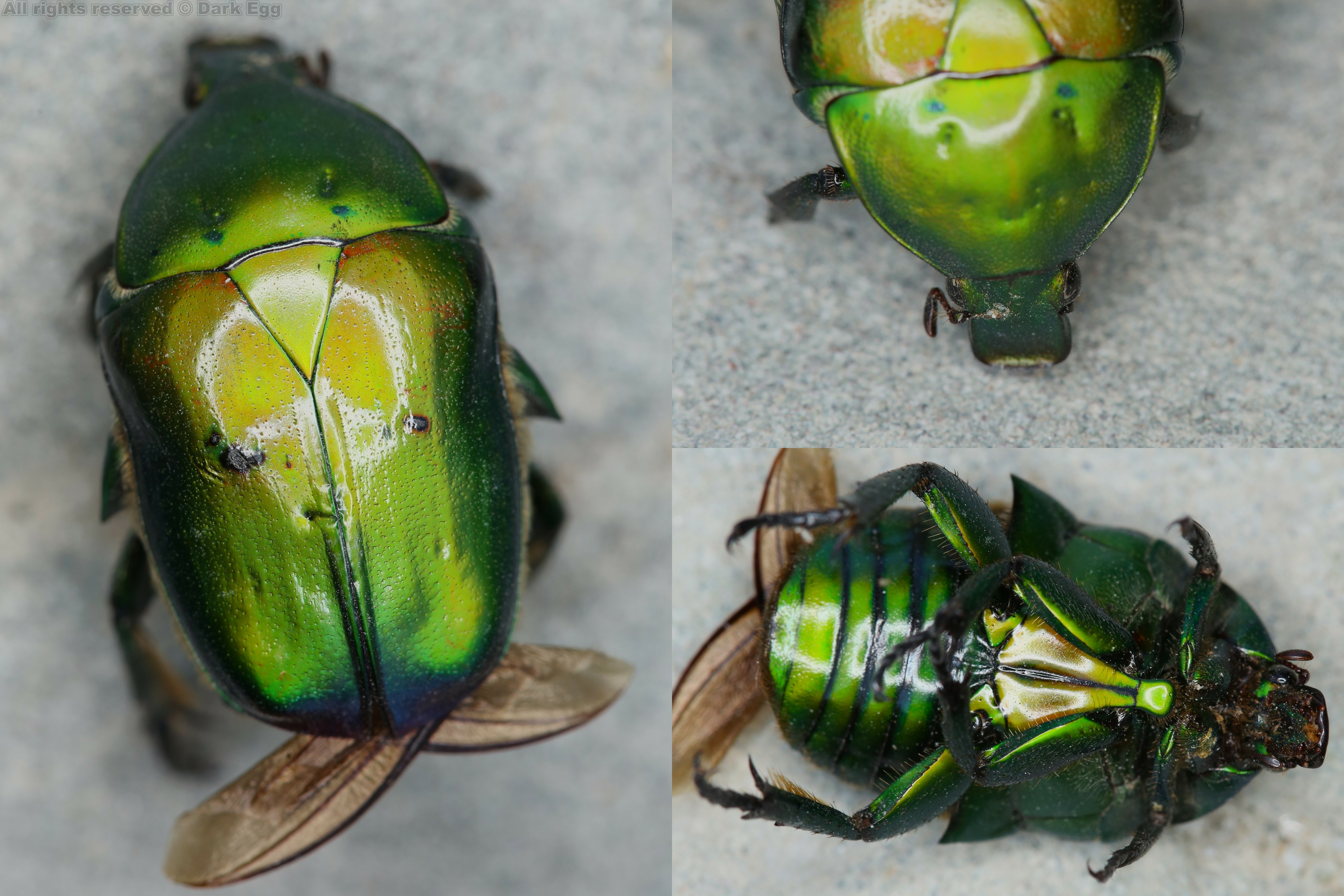 以前被认为是罗花金龟属的成员,可以通过腹面的形态鉴别。